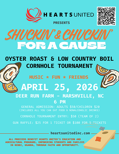 I acknowledge that I am registering to participate in various activities, including playing in the cornhole tournament, at my own risk. I understand that registration fees are non-refundable and support Hearts United’s agricultural and education programs in Nebbi, Uganda. I agree to follow all tournament rules and event staff instructions, and I understand that unsportsmanlike or unsafe behavior may result in disqualification. I agree that Deer Run Farm, Hearts United, property owners, event staff, volunteers, sponsors, and other participants will not be held liable for any injury, damage, or loss incurred during the event. I grant Hearts United permission to use photos, video, and likeness for promotional purposes. Participants under 18 require parental or guardian consent.